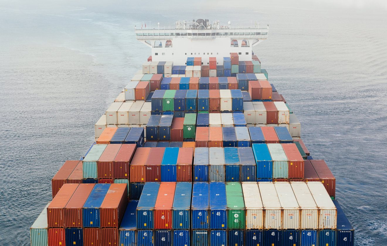 Witness global trade in motion as a mighty cargo ship navigates the vast ocean, symbolizing the interconnectedness of our world.