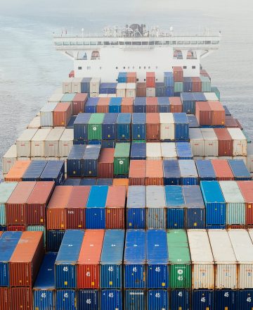 Witness global trade in motion as a mighty cargo ship navigates the vast ocean, symbolizing the interconnectedness of our world.